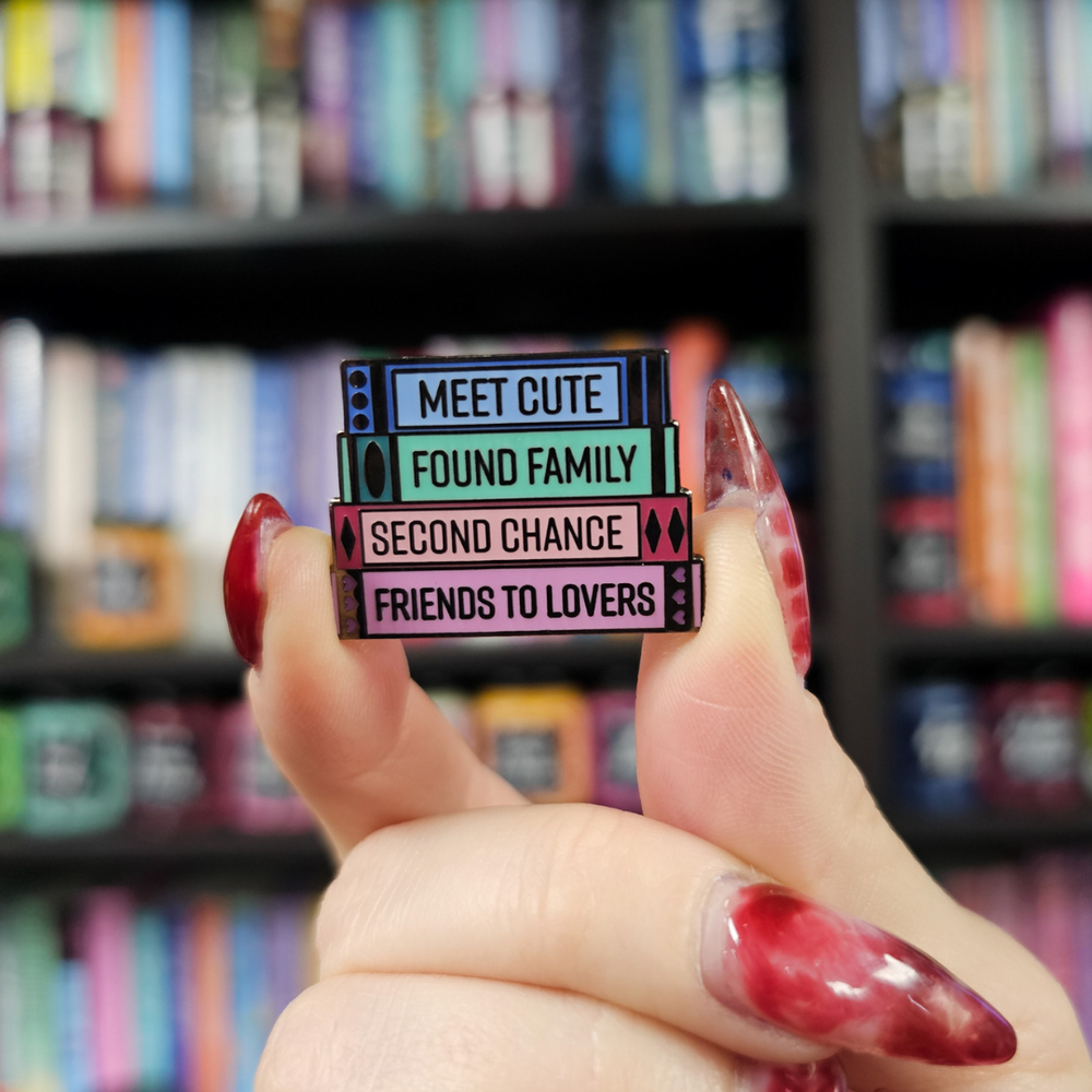 Indulge your senses in a world of sweetness with our 'Sweet Book Stack' enamel pin! This adorable accessory celebrates the joy of some lighthearted book tropes: Meet Cute, Found Family, Second Chance, and Friends-to-Lovers! If the spicier tropes are more your style, make sure to check out our Spicy Book Stack Pin!
