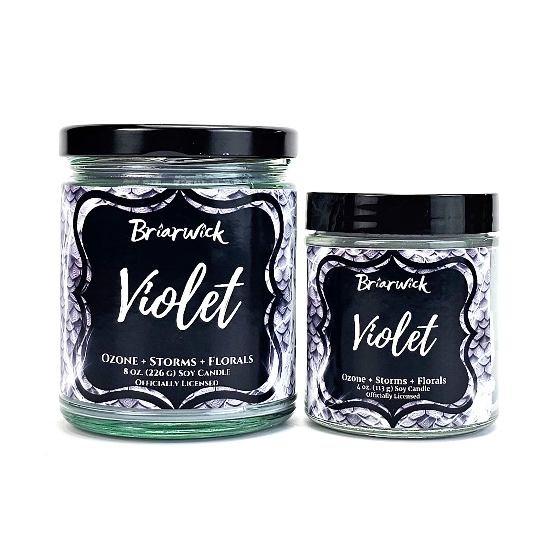 Violet 8oz & 4oz slate gray candles with gray dragon scale designs on a white background